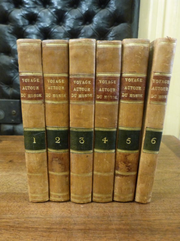 Paris, de l'imprimerie de Didot jeune, 1802. 6 volumes in-8, demi basane époque, dos lisses ornés de filets dorés, titre doré, toutes tranches jaunes. Faux-titre, titre, VIII, 341 pp; faux-titre, titre, 384 pp; faux-titre, titre, 381 pp; faux-titre, titre, 438 pp; faux-titre, titre, + planches (atlas). Seconde édition française avec l'atlas qui contient 17 vues et 9 cartes, dont 8 dépliantes (complet). Mors supérieur du tome I fendu (mais toujours solidaire du plat), petit travail de ver sur le mors inférieur du tome V (sans gravité), quelques rousseurs.