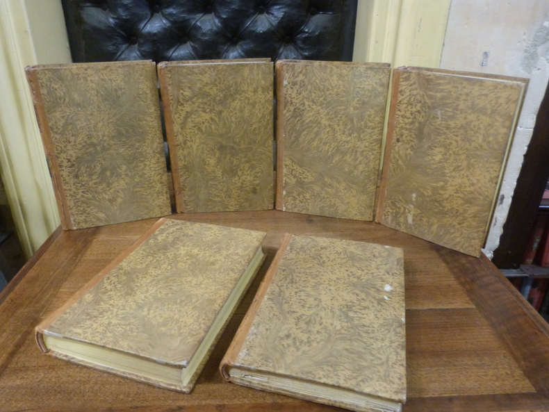 Paris Impr. de Didot jeune 1801 -in-8 plein-veau 6 volumes (5 volumes de texte et et un atlas), reliure plein veau marbré havane in-octavo (20,5 x 13 cm), dos long (spine without raised band), décoré "or", titre et tomaison frappés "or", pièce de titre et de tomaison sur fond noir avec filet "or" de part et d'autre, roulette chainette "or" en place des nerfs avec un filet "or" de part et d'autre et en tête et en pied, entre nerfs avec alternativement un semi de fleurette en grillage "or" ou un fleuron central "or" avec un filet perlé "or" de part et d'autre,( dos trés légèrement frotté avec léger manque de dorure), plats décorés "or" d'un encadrement d'une roulette "or" et d'un filet "or" ( plats trés légèrement frottés avec léger manque de dorure), coins émoussés (corners blunt), roulette sur les coupes (fillets on the cuts) avec léger manque de dorure, toutes tranches lisses peignées bleu et rose, etiquette EX-LIBRIS manuscrite à l'encre brune au dos du premier plat : A. M. Macé de Vaudoré [MACÉ DE VAUDORÉ (Jean-François de): Ecrivain NANTAIS auteur du Dictionnaire historique, géographique et topographique de Nantes et de l'ancien Comté Nantais, Librairie Merson, Nantes, 1886], Volume I : (VIII + 341) pages, , Volume II : 384 pages, Volume III : 381 pages, Volume IV : 368 pages, Volume V : 438 pages, Volume VI : ATLAS de 17 vues hors-texte gravée en noir par Tardieu + 9 cartes hors-texte en noir (dont huit cartes dépliantes) par Tardieu, an X [1801] Paris : Impr. de Didot jeune Editeur,