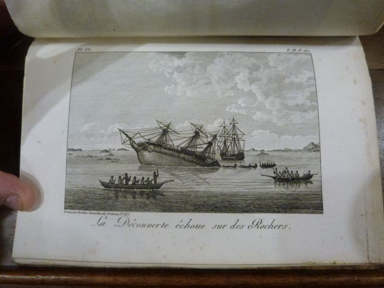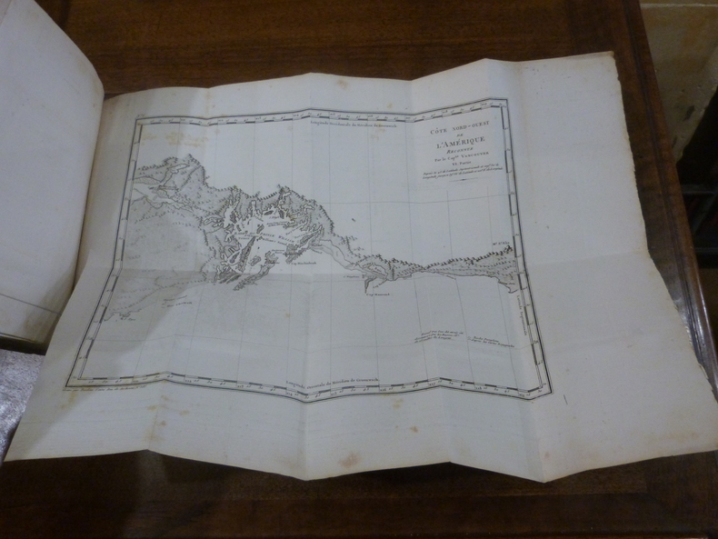 Seconde édition française, parue 2 ans après la première. George Vancouver prit part en qualité d'officier aux second et troisième voyage de Cook autour du monde. En 1782 il reçut le commandement des vaisseaux Chatham et Discovery avec mission de se rendre en Amérique du Nord pour y prendre possession du territoire de Noutka, cédé par l'Espagne à l'Angleterre, et explorer la côte occidentale de l'Amérique et les îles Sandwich. Après avoir relevé une grande partie de la côte sud-ouest de la Nouvelle-Hollande (Australie), Vancouver compléta la reconnaissance des îles Sandwich et de Tahiti puis releva de 1791 à 1795 avec une grande précision le littoral canadien de l'Ouest, visitant les tribus locales, les établissements russes et les missions espagnoles de la côte. Il fit escale au Chili avant de passer le cap Horn et de rejoindre l'Angleterre, où il mourut en 1798 à l'âge de 40 ans des fatigues accumulées lors de son voyage. (Chadenat, 1221).
