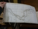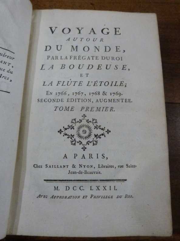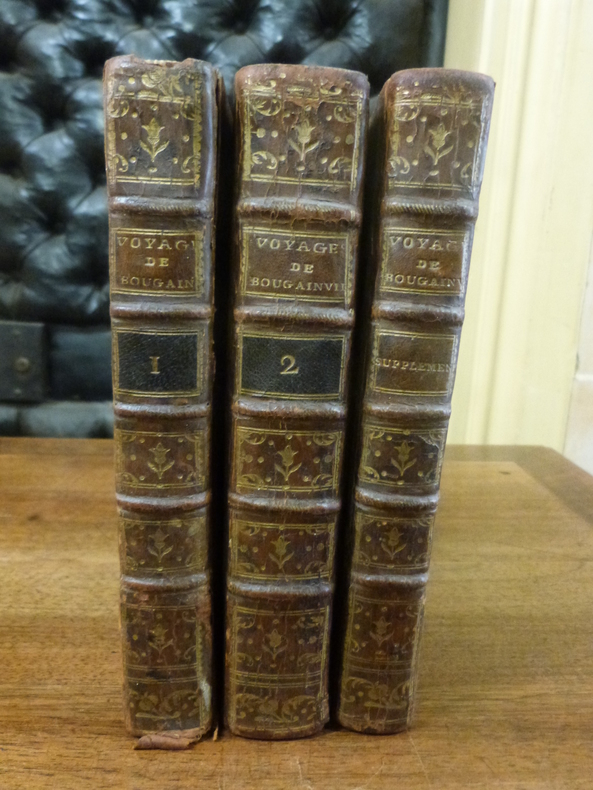Première édition in-octavo (suivant l'in-quarto de 1771) du récit du célèbre navigateur Louis Antoine de Bougainville (1729-1811), premier Français à avoir effectué une circumnavigation. Suivie de l'édition originale en français du premier périple de James Cook autour du monde. Navigateur, mathématicien et soldat français, Bougainville a largement contribué aux progrès de la science et de la géographie du XVIIIe siècle en localisant avec précision quelques îles et archipels et en effectuant le relevé topographique dune partie des îles Salomon. Grâce à ses précisions, on a pu donner à la carte du Pacifique des mesures exactes. Le récit de voyage de Bougainville a jeté les assises des futures explorations françaises dans le Pacifique ; il est par ailleurs, à lorigine de la légende de Tahiti, île paradisiaque des mers du Sud. Mais Bougainville est peut-être avant tout un philosophe. Cest en tout cas ainsi que le décrit Diderot qui admire en lui toutes les qualités prisées alors par les grands esprits de ce siècle des Lumières en pleine expansion. Bougainville est en quelque sorte lenfant chéri des encyclopédistes et lorsquil quitte la France en 1766 pour son célèbre tour du monde, il va innover dans la manière de concevoir lexploration. Il est en effet le premier dans lhistoire des grands voyages maritimes à emmener avec lui trois véritables savants : le naturaliste Commerson (ami de Jussieu et disciple de Buffon), lastronome Véron, qui améliorera la méthode de calcul des longitudes, et le cartographe Romainville. Le tour du monde de Bougainville est resté célèbre, moins pour ses découvertes scientifiques que pour des raisons parallèles qui en font peut-être et avant tout, ce que lon pourrait appeler un « voyage littéraire ». Le présent récit des aventures de "La Boudeuse" et de "LEtoile" publié par Bougainville quelques années après son retour connaît un succès considérable, qui se poursuit dailleurs encore de nos jours : on trouve toujours en librairie son "Voyage autour du monde" et Bougainville est incontestablement un écrivain même sil est celui dun seul livre. Le troisième volume de cet ouvrage est constitué de la traduction, par La Touche de Treville, de la relation de la première expédition du célèbre capitaine Cook autour du monde, autre figure majeure des explorations maritimes de la seconde moitié du 18ème siècle. Il s'agit d'une édition pirate, parue deux ans avant la première édition officielle française en quatre volumes (1774). Le texte est accompagné dun « Vocabulaire de lîle de Tahiti » et dobservations linguistiques de Pereire sur un locuteur tahitien. Les deux premiers volumes sont illustrés de 21 cartes marines dont 16 dépliantes et de 3 planches gravées. 3 vol. 8vo (205 x 130 mm) of : I. [4] ff. (faux-titre, title, epistle) ; XLIII (preliminary speech) ; 336 pp. ; II. [2] ff. (false title, title) ; 453 pp. ; [3] pp. (approval, privilege, notice to bookbinder) ; III. [1] f. (false title) ; XVI (warning) ; 362 pp. ; [3] pp. (approval, privilege) ; 3 plates and 21 folding maps (numbered from 1 to 20, 16 being in two parts). (Some spotting). Contemporary full marbled calf, ornate ribbed spine, red morocco title-piece, red edges, marbled paper end-papers (Bindings very worn and missing). First in-octavo edition (following the in-quarto of 1771) of the account by the famous navigator Louis Antoine de Bougainville (1729-1811), the first Frenchman to complete a circumnavigation. Followed by the original French edition of James Cook's first voyage around the world. A French navigator, mathematician and soldier, Bougainville made a major contribution to the progress of 18th-century science and geography, accurately locating several islands and archipelagos and surveying part of the Solomon Islands. Thanks to his precision, the map of the Pacific was able to be accurately measured. Bougainville's account of his voyage laid the foundations for future French explorations in the Pacific, and is also the source of the legend of Tahiti, the paradise island of the South Seas. But Bougainville was perhaps above all a philosopher. At least, that's how Diderot describes him, admiring in him all the qualities prized by the great minds of the burgeoning Age of Enlightenment. Bougainville was, in a way, the encyclopedists' favourite child, and when he left France in 1766 for his famous round-the-world voyage, he broke new ground in the way he conceived exploration. In fact, he was the first person in the history of great maritime voyages to take three genuine scientists with him: the naturalist Commerson (a friend of Jussieu and disciple of Buffon), the astronomer Véron, who improved the method of calculating longitudes, and the cartographer Romainville. Bougainville's circumnavigation of the globe has remained famous not so much for its scientific discoveries as for parallel reasons, making it perhaps above all what might be called a literary voyage. The present account of the adventures of La Boudeuse and L'Etoile, published by Bougainville a few years after his return, met with considerable success, which continues to this day: his Voyage autour du monde is still available in bookshops, and Bougainville is undeniably a writer, even if he is the author of a single book. The third volume of this work is La Touche de Treville's translation of the report of the first expedition of the famous Captain Cook around the world, another major figure in the maritime explorations of the second half of the 18th century. This is a pirate edition, published two years before the first official four-volume French edition (1774). The text is accompanied by a Vocabulaire de l'île de Tahiti and linguistic observations by Pereire on a Tahitian speaker. The first two volumes are illustrated with 21 nautical charts, including 16 fold-outs, and 3 engraved plates.