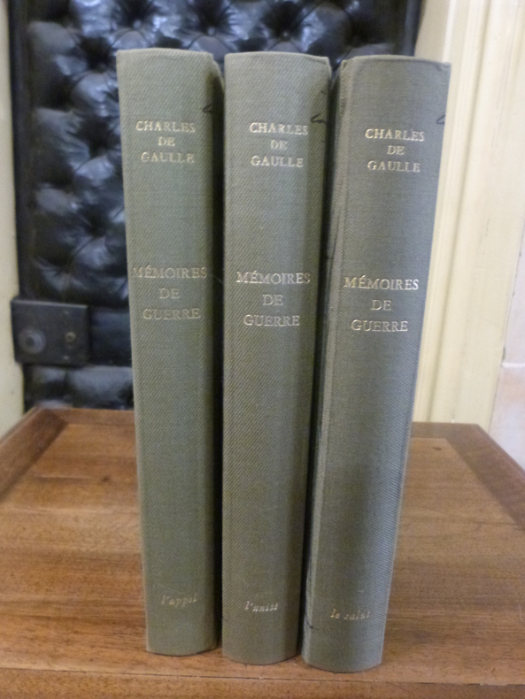 Paris, Librairie Plon, 1962. 3 tomes in-4 en pleine toile de l'éditeur avec aux centres des 1er plats un médaillon en métal. 293 pp, 2 ff non chiffrés, 359 pp, 2 ff non chiffrés, 372 pp, 2 ff non chiffrés. Nombreuses illustrations in et hors texte en noir et 30 planches de fac-similés, cartes et plans. 1ère édition illustrée des Mémoires de Guerre de de Gaulle. Notre exemplaire contient un envoi autographe de de Gaulle à Fernand Coudray "Pour Fernand Coudray , en souvenir de la grande épreuve. "C. de Gaulle." Manque les rhodoïds, sinon très bon état.