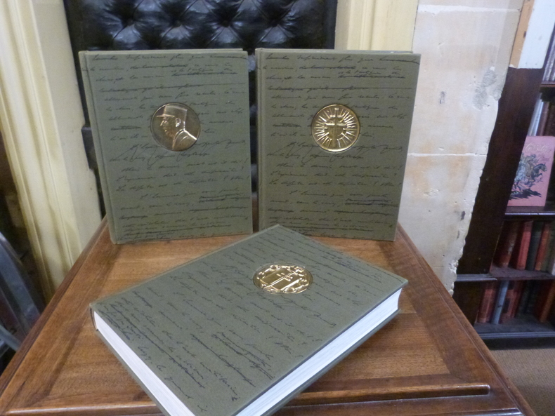 “A M. Emile Henriot, en témoignage de mon admiration et de mon amitié. C. de Gaulle. 4.7.56.” L’édition originale des Mémoires de guerre de Charles de Gaulle, précieux exemplaire offert et dédicacé par l’auteur à Emile Henriot. Paris, 1954-1956-1959. En Français dans le texte, 398. Gaulle, Charles de. Mémoires de guerre. L’Appel (1940-1942)- L’Unité (1942-1944)- Le Salut (1944-1946). Paris, Librairie Plon, 1954-1956-1959. 3 volumes in-8 de : I/ (4) ff., 680 pp., (2) ff., 1 carte dépliante; II/ (4) ff., 712 pp., (2) ff., 1 carte dépliante; III/ (5) ff., 653 pp., (1) f., 1 carte dépliante. Reliés en demi-maroquin rouge à coins, filet doré soulignant la séparation, dos à nerfs ornés de filets à froid, titre doré, tête dorée, non rognés, couvertures et dos conservés. Reliure signée A. & R. Maylander. 225 X 140 mm. édition originale des ‘mémoires de guerre’ du général de Gaulle, dont les deux premiers tomes font partie des exemplaires tirés sur alfa réservés aux anciens de la FranceLibre et aux membres des associations combattantes et résistantes de la guerre, celui-ci numéroté 1923. Le troisième tome imprimé sur bouffant spécial fut réservé pour Émile Henriot avec son étiquette. «Le 22 octobre 1954 paraissait ‘L’Appel’, premier volume des ‘Mémoires de guerre’ du général de Gaulle. Une fois de plus, l’homme du 18 Juin créait l’événement. Ayant quitté le pouvoir en janvier 1946 pour ne pas cautionner un gouvernement d’assemblée, il avait tenté sans succès d’y revenir par la voie des élections. Retranché à Colombey, il y poursuivait une amère traversée du désert.‘L’Appel’, loin de toute contestation politique, le remettait au premier plan. Retentissement national. Unanimité littéraire dans l’admiration. Cent mille exemplaires vendus en un mois et bientôt une diffusion mondiale : quatre ans plus tard, l’ouvrage était publié dans tous les pays non communistes d’Europe sauf la Grèce, ainsi qu’en U.R.S.S., aux États-Unis, en Amérique latine, à Beyrouth, en Israël et à Hong Kong. Le deuxième tome, sorti en 1956, eut un égal succès ; le troisième, publié alors que de Gaulle était revenu au pouvoir, fut discuté mais, dès 1961, la vente cumulée des trois volumes en France dépassait le million d’exemplaires. Grande œuvre littéraire, les ‘Mémoires de guerre’ ont comblé un vide historique. Aux Français des années 1950, abreuvés de littérature résistante, mais peu instruits de l’épopée de la France libre, ils ont révélé, documents à l’appui, le déroulement de la plus grande aventure collective française du siècle et la lutte acharnée menée par un rebelle hors du commun pour faire remonter la France de l’abîme et l’imposer comme puissance victorieuse. La réécriture de l’histoire par un de ses acteurs n’en diminue pas, pour l’essentiel, la véracité. Elle joignait à la chronique un message implicite : non seulement le maître d’énergie a entendu rappeler aux Français ce qu’ils lui devaient, mais il a souhaité les rassembler autour de la meilleure image d’eux-mêmes et les inciter à un avenir digne d’une grande nation. En cela, l’œuvre historique était également politique. Elle l’aura été doublement, car le succès des ‘Mémoires de guerre’ aura été une étape sur la voie du retour au pouvoir du général de Gaulle.» (Jean-Louis Crémieux-Brilhac, Préface des Mémoires de guerre de De Gaulle dans la collection La Pléiade). Charles de Gaulle expose dans cet ouvrage l'épopée de la France Libre au cours de la Seconde Guerre mondiale et décrit son déroulement avec beaucoup de minutie. Il inclut pour étayer ses propos des documents en annexe tels que de nombreux télégrammes échangés pendant la guerre entre diverses personnalités politiques et militaires, ou des cartes des diverses opérations militaires entreprises par la France. «Les ‘Mémoires de guerre’ sont un beau succès de librairie. La vente atteint rapidement les 100000. Quand paraîtra le troisième tome, 150000 exemplaires de l’ouvrage complet garniront les bibliothèques privées et publiques. A ce jour, il en aurait été vendu en tout 750000, et l’ouvrage a été traduit en vingt-deux langues, parmi lesquelles le chinois, le finnois, le turc. La presse, d’emblée, a été admirative. ‘Chez de Gaulle écrivain, on trouve le même esprit et la même discipline qui animait l’homme d’action, la même flamme…’ (Marcel Arland, Nouvelle revue française). ‘La lecture de ces Mémoires achève de convaincre qu’un grand homme est presque toujours un grand écrivain’ (Georges Duhamel, Nouvelles littéraires). ‘Il est prestigieux dans ses raccourcis… avec des traits à la Tacite, à la Retz, à la Saint-Simon’ (Emile Henriot, Le Monde)… Les ‘Mémoires de guerre’ sont aussitôt devenus un grand classique du genre et l’écrit contemporain le plus propre à entretenir dans les nouvelles générations le sens de la patrie.» (En Français dans le texte, 398). Alors que l’année 2010 marque les 120 ans de la naissance du général de Gaulle, les 70 ans de l’Appel du 18 juin 1940 et les 40 ans de la mort du général de Gaulle, elle marque également les 10 ans de l’entrée des Mémoires du général dans la Bibliothèque de la Pléiade. Précieux exemplaire de présent portant sur les faux-titres de chacun des trois tomes un respectueux envoi autographe signé du Général de Gaulle à Emile Henriot: ”A M. Emile Henriot, dont j’admire fort le talent avec le témoignage de ma haute considération. C. de Gaulle. 18 octobre 1954” (tome 1) / «A M. Emile Henriot, en témoignage de mon admiration et de mon amitié. C. de Gaulle. 4.7.56» (tome 2) / «En gratitude et en admiration. C. de Gaulle. 7.11.59» (tome 3). L’exemplaire est en outre truffé de deux lettres autographes du Général de Gaulle (chacune 