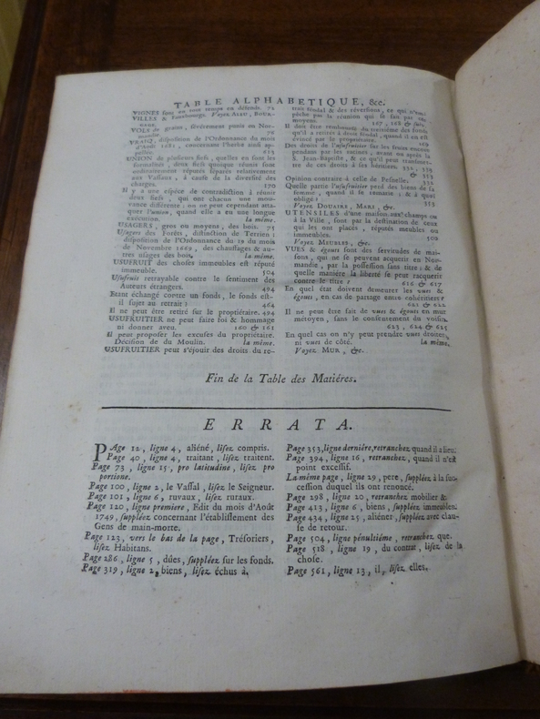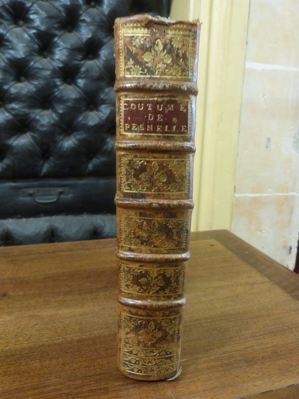 Rouen R. Lallemant 1759 -in-4 plein-veau un fort volume, reliure plein veau (binding full calfskin) havane in-quarto (20,6 x 26,4 cm), RELIURE D'EPOQUE, dos à nerfs (spine with raised bands), décoré "or" et à froid (gilt and blind stamping decoration), titre frappé "or", pièce de titre sur fond marron clair avec double filets "or" en encadrement, roulette "or" en place des nerfs avec un filet à froid de part et d'autre des nerfs, entre-nerfs à fleuron "or" dans un encadrement de deux filets "or" avec fleurette (floweret), roulette et double filets "or" en tête et en pied, coiffe supérieure manquante avec 5 petits trous de vers en tête, mors du premier plat fendu sur 3 cm en tête et 5 cm en pied, mais la reliure est trés solide, plats frottés et légèrement épidermés, coins écornés (corners dog-eared), roulette "or" sur les coupes avec manque de dorure, toutes tranches lisses rouges (all edges red), marques de tampons "EX-LIBRIS" à l'encre brune d'un cabinet d'avocats de Granville sur la page de titre, ([XVI] + 732 + [85 p.de table]) pages avec Approbation & Privilège, 1759 Rouen : R. Lallemant Editeur,