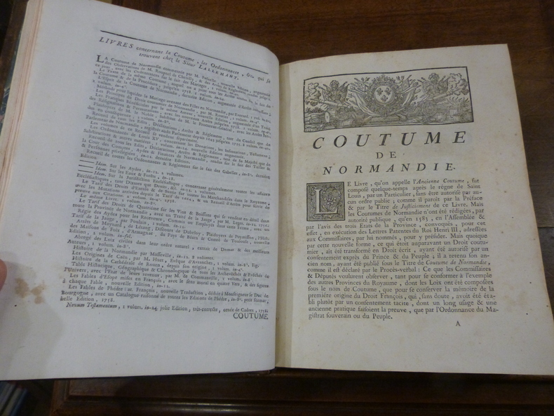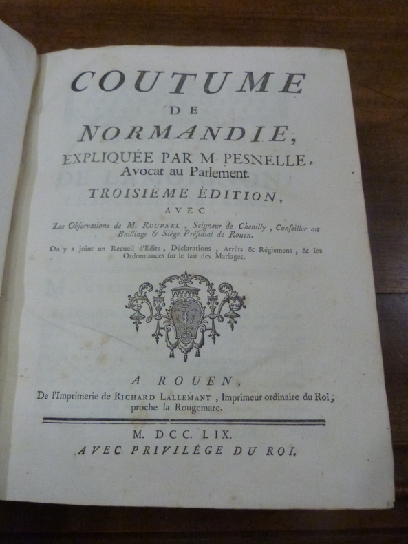 Autre auteur : Roupnel de Chenilly. Annotateur .....Coutume de Normandie expliquée par M. Pesnelle, avocat au parlement, 3ème édition, avec les observations de M. Roupnel. On y a joint un recueil dédits, déclarations, arrêts et réglemens, et les ordonnances sur le fait des mariages..........COUTUME DE NORMANDIE : La législation anglaise a conservé de larges portions du droit normand, y compris dans les procédés, les formules et le langage. Le droit anglo-gallois reste lui aussi imprégné de droit normand. Aujourdhui encore, la coutume de Normandie inspire la législation des parties de la Normandie dépendant de la couronne britannique, notamment la clameur de haro qui reste en vigueur à Sercq, Jersey et Guernesey, ainsi que la plupart des dispositions sur la succession et les fiefs. Les juristes se destinant à la profession davocat ou davocat-conseil à Guernesey (ou, jusquà récemment, à Jersey) doivent compléter un cycle détude de six mois en droit normand à luniversité de Caen et obtenir un Certificat détudes juridiques françaises et normandes avant de pouvoir sinscrire au barreau de Guernesey, dont dépendent les îles d'Aurigny, Sercq et Guernesey (il est devenu facultatif pour l'inscription au barreau de Jersey, depuis 1991). Perdure aussi la coutume du retrait lignager, qui donne la possibilité à un enfant, de contester la vente d'un bien, réalisée par ses parents. Cette coutume a été abolie à Jersey au XIXe siècle, puis abolie, à Guernesey, en 2012. Elle s'applique encore à Sercq. ...RARE............en bon état malgré les petits défauts signalés (good condition in spite of the small defect indicated). bon état
