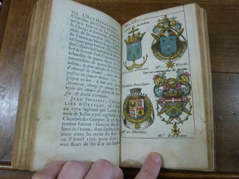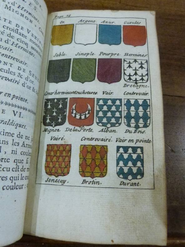 Paris, Osmont, 1717. In-12, plein veau époque, dos à nerfs orné de fleurons dorés, titre doré. Titre, 6 ff non chiffrés, 291 pp, 17 pp non chiffrées. Ouvrage illustré d'un frontispice rehaussé en couleurs et de 32 planches de blasons hors-texte (sur 35), dont 31 sont rehaussées en couleurs. 3 coins émoussés, 2 manques au dos, coiffe supérieure manquante, coiffe inférieure abîmée, quelques rousseurs, mouillure dans la marge supérieure en fin de volume, manque 3 planches.