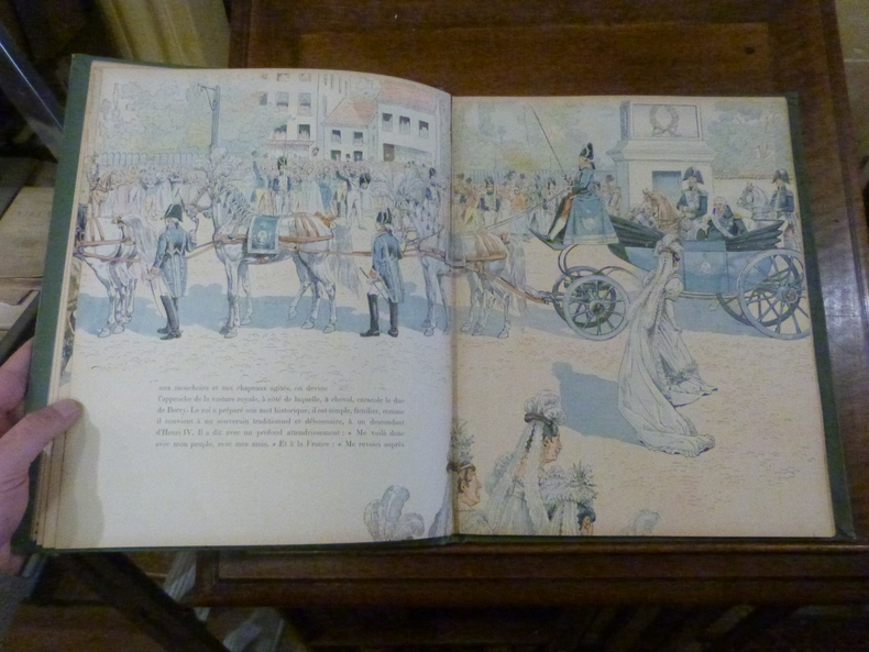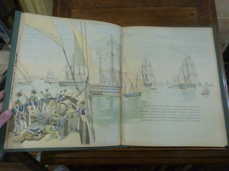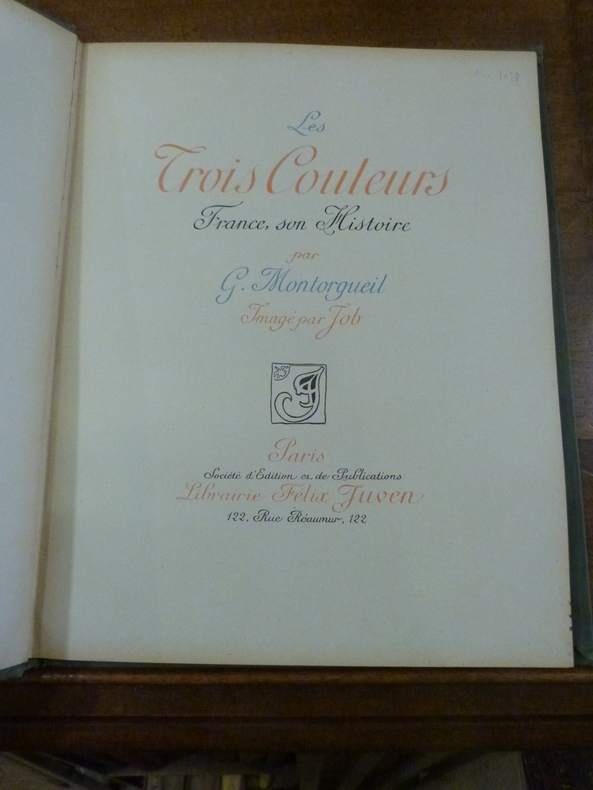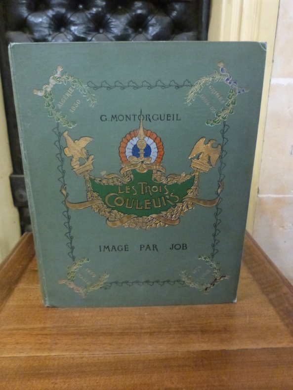 Paris, Charavay, Martin, éditeurs, s. d. [1900], 1 vol. in-folio (35,7 x 29 cm), non-paginé [40 f., faux-titre et titre inclus]. Histoire romancée de la France où se mêlent patriotisme et exaltation des valeurs morales et identitaires. Les différents théâtres de guerre émaillant l'histoire française au cours du XIXème siècle sont expliqués. Les émotions, celles du peuple et celles des hommes au pouvoir, ont une large place. Georges Montorgeuil, pseudonyme d'Octave Lebesgue (1857-1933) : journaliste, auteur et éditeur parisien. Job, Jacques Onfroy de Bréville, (dit) (1858-1931) : dessinateur, caricaturiste français. Dessins d'un grand raffinement graphique et coloré : subtiles couleurs, parfois intenses, parfois pastels. De très nombreux détails précisent les tenues vestimentaires, lieux de vie, etc. ainsi que la physionomie des personnes, parfois peu flatteuse.