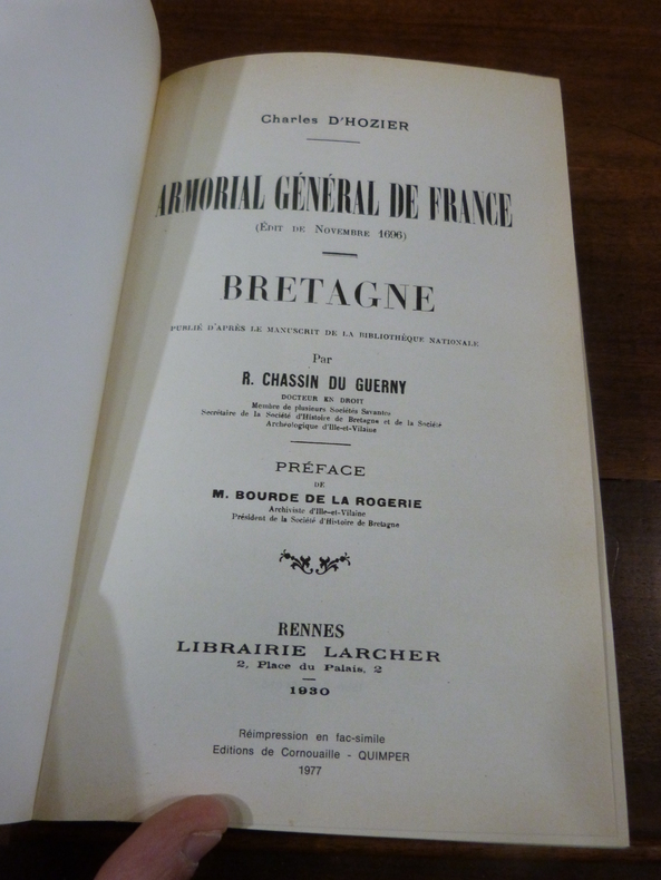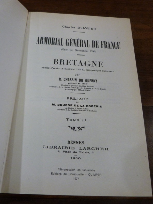 Quimper, Editions de Cornouaille, 1977. 2 volumes in-8, pleine toile éditeur. Titre, 3 ff non chiffrés, XXIV, 470 pp; faux-titre, titre, 1 f non chiffré, 525 pp. Fac-similé, réimpression de l'édition de 1930, parue à Rennes chez Larcher. Papier légèrement jauni, sinon bon état.