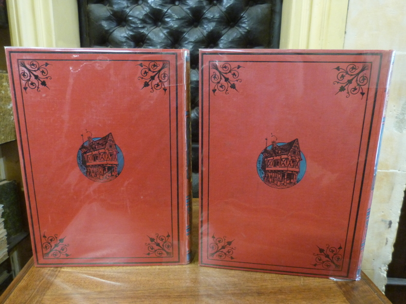 Paris, La Librairie Illustrée, sans date (1885-1886). 2 volumes in-folio, percaline éditeur signée Engel, ornée d'un décor polychrome de Souze. Faux-titre, titre, 1 f non chiffré, VIII, 494 pp; faux-titre, titre, 484 pp. Ouvrage illustré de 49 planches, dont 8 en couleurs, 9 en noir et 32 en camaïeu et de nombreuses compositions in-texte par Robida. Très belle état de fraîcheur de la reliure malgré quelques menus défauts: une griffure sur le plat supérieur du tome II et quelques taches peu visibles), date rajoutée à l'encre sur les page de titre, quelques rousseurs et 1 petite mouillure maginale sur quelques feuillets au tome I.