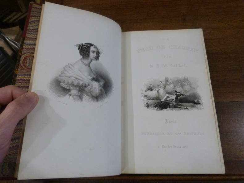 1838 1838. Grand in-8 (272 x 163 mm.). La Peau de chagrin. Etudes sociales. Delloye et Lecou, Grand in-8 demi-veau bleu nuit , dos à nerfs orné de filets dorés et pièces Première édition illustrée et premier tirage des cent vignettes dans le texte de Baron, Janet-Lange, Gavarni, Français, Marckl, gravées sur acier par Brunellière, Nargeot, Langlois, etc.. Tres bel état , peu de rousseurs .
