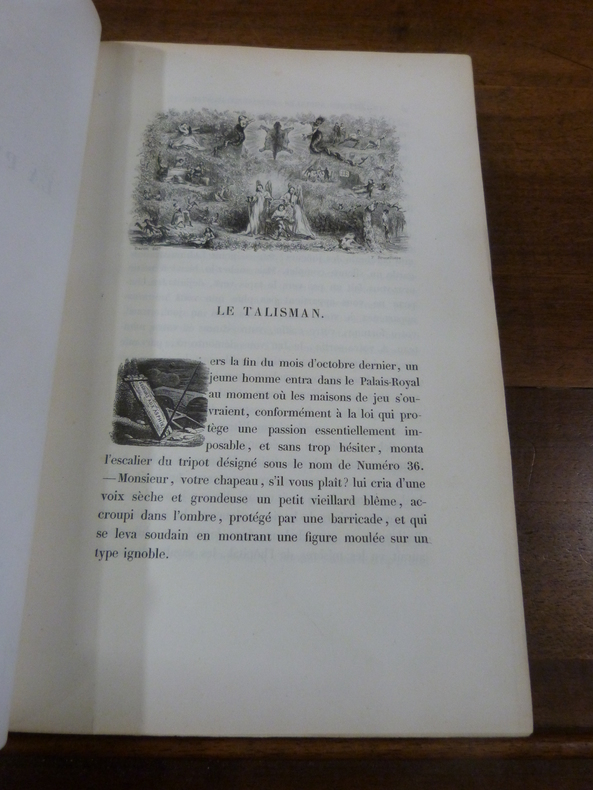 Première édition illustrée.Elle comprend cent vignettes dans le texte, plus celle du titre, d’après des dessins de Bron, Janet-Lange, Gavarni, Français, Marckl, et gravées sur acier notamment par Brunellière, Nargeot, Langlois. "Le tirage a été fait après l’impression du texte, ce qui offrait de grandes difficultés d’exécution heureusement surmontées" (Brivois). Premier tirage.Cet exemplaire comporte bien les remarques typographiques de premier tirage citées par Carteret et la vignette de titre représentant un homme tiré en arrière par un squelette armé d’une faux. "Si le squelette a disparu comme s’il avait été effacé (car il ne reste plus que la trace d’une main et de l’avant-bras), ces titres sont d’un tirage postérieur" (Carteret). La vignette du jardinier figure p. 303. "C’est à partir de cet ouvrage que Balzac devient M. de Balzac" (Carteret).La Peau de chagrin "fait partie des œuvres les plus connues et les plus lues de Balzac". Elle est considérée comme la première oeuvre des "Etudes philosophiques" de l'auteur, dont elle constitue, avec les romans "Louis Lambert" et "Recherche de l’absolu", "une des pièces maîtresses" (Dictionnaire des œuvres). Balzac a indiqué, dans une lettre adressée à Charles de Montalembert que ce roman évoquait "la formule de la vie humaine" et que tout y était "mythe et figure" (cité par Michel Brix).Une élégante reliure reprenant les décors romantiques.Yseux s’associa avec Thierry, successeur de Petit, lui-même successeur de Simier Fils. En 1915, il reprit l’affaire et signa toujours "Yseux successeur de Thierry-Simier". "Yseux eut une clientèle de bibliophiles et nombreuses sont les ventes de bibliothèque où figurent sa signature" (Fléty).Très bel exemplaire en reliure d'Yseux.Carteret, I, p. 60 et III, p. 41. Vicaire, I, 184. Fléty, p. 178. Brivois, "Bibliographie des ouvrages illustrés du XIXe siècle", p.15. "Dictionnaire des œuvres", V, p.174. Michel Brix, "La Peau de chagrin : Balzac et la hantise du vieillissement", Bruxelles, Académie royale de langue et de littérature françaises de Belgique, 2019, p. 1.