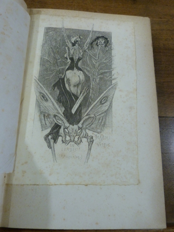 Paris, Edinger, 1887. In-8, demi percaline époque, dos orné d'un fleuron doré, titre doré. Faux-titre, titre, 2 ff non chiffrés, IV, 343 pp. Edition originale, illustré d'un frontispice de Félicien Rops, placé après la page de titre et d'un format plus petit que l'ouvrage, provenant peut-être d'un des exemplaires in-16 parus en même temps que les exemplaires in-8, couvertures conservées. Exemplaire légèrement gauchi, coins et coiffes légèrement frottés, papier jauni, rousseurs, frontispice piqué, couvertures conservées salies.