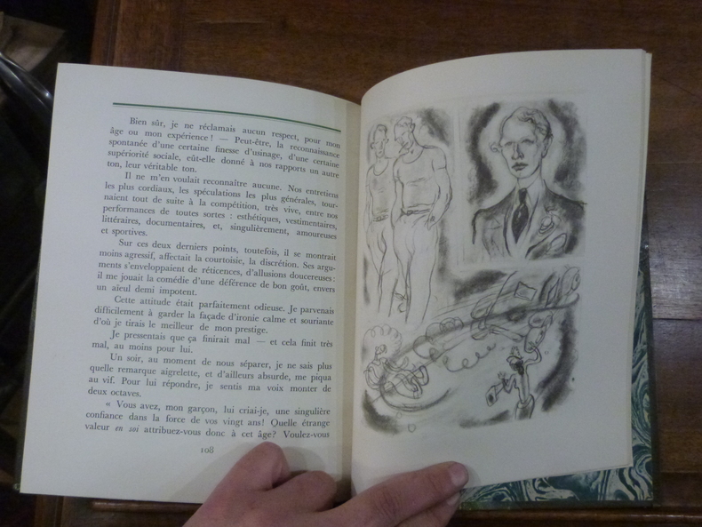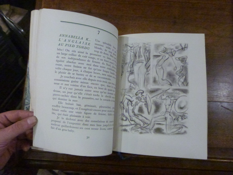 Maquette typographique présentant les couvertures, le faux-titre au dos duquel est contrecollée la justification illustrée d’un bois, avec des indications manuscrites, deux essais de pages de titre tirées en rouge, puis le texte imprimé et contrecollé sur des feuillets blancs présentant deux numérotations différentes.Nombreuses indications dans les marges, corrections dans le texte, surlignage de certains passages en vert.Les espaces pour les hors-texte ont été laissés vacants. Les culs-de-lampe ont été indiqués au crayon vert : 17 gribouillis indicatifs ou croquis plus précis (vélo, fumeur, deux drapeaux croisés, automobile, skieur, tombe…). Tout porte à croire qu’ils sont de la main de Gus Bofa. Dernier cul-de-lampe imprimé et contrecollé.On trouve ensuite diverses pages du texte imprimé illustré de six eaux-fortes dont deux répétées. Les pages sont en deux états en noir et avec le titre contrecollé et tiré en vert, de même pour les filets typographiques en haut du texte.
