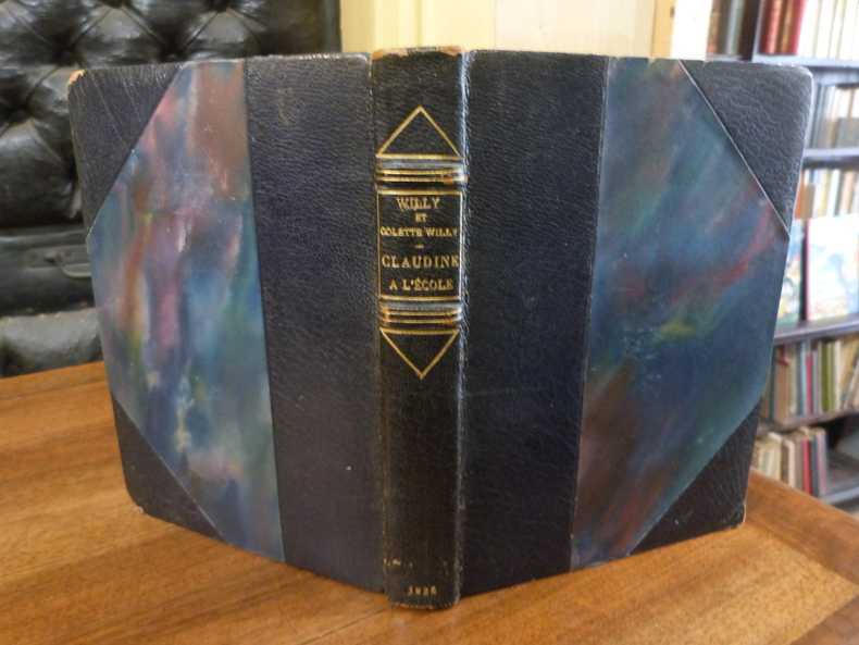 Paris, Ollendorff & Mercure de France, 1900-1903. Quatre volumes in-12. Claudine à l'école. 1900 (couv. illustrée conservée) / Claudine à Paris. 1901. (Couv. conservée ill. en couleurs par Rassenfosse) / Claudine en ménage. 1902. (Mercure de France éditeur) / Claudine s'en va. 1903. ( Couv. conservée ill. en couleurs par Pasan). Maroquin rouge janséniste, dos à nerfs, auteur et titre en lettres dorées, étuis à rebords, doublure int. ornée de filets dorés et entrelacs, têtes dorées étuis bordés. Reliure de Marcel Martin.