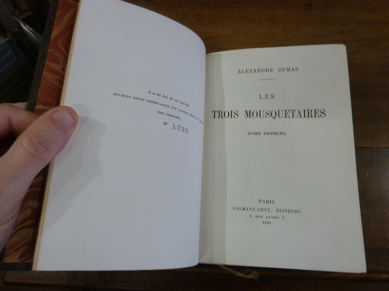 1854 1854 Paris, Bureaux de l'Echo des Feuilletons 1854 2 in-4 (27 x 17cm) Reliure Demi-Chagrin Brun dos à nerfs 2x500[pp] Les Mousquetaires, précécé de l'Auberge de Béthune chez Marchant Editeur du Magasin Théâtral 1845 Représenté pour la première fois, à Paris, sur le Théâtre de l'Ambigu-Comique (27 oct. 1845). Paris, Marchant, 1845, gr. in-8 de 59 pp. (Edition Originale).Les Trois Mousquetaires et sa suite 1854Vingt Ans Après 1854Nombreuses illustrations et ornements, lettrines.Edition très rare, cuir parfait état.