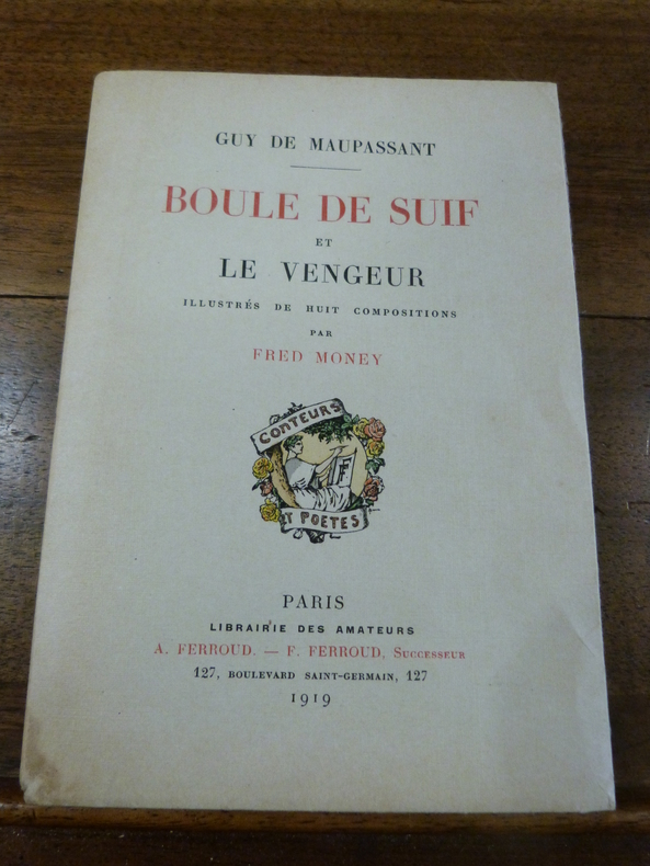 Par Guy de Maupassant. Illustrés de huit compositions par Fred Money, gravées sur bois par Clément et Deloche.Edition tirée à 1250 exemplaires. Celui-ci N°1108, un des exemplaires sur beau papier vélin d'Arches, avec les gravures dans le texte.Paris, Librairie des amateurs - A. Ferroud - F. Ferroud successeur - 1919 - 109 pages.Reliure demi maroquin mosaïquée à coins signée Blanchetiere. Dos lisse à filets dorés avec une pièce de titre et d'auteur. Tête dorée sur témoins. Signet. Couverture et dos conservés. Pas de rousseur. Très bon état. Format in-12°(17x12).Boule de suif est une nouvelle écrite dans le courant de l'année 1879, rendue publique en 1880, et publiée dans les soirée de Médan en 1880.