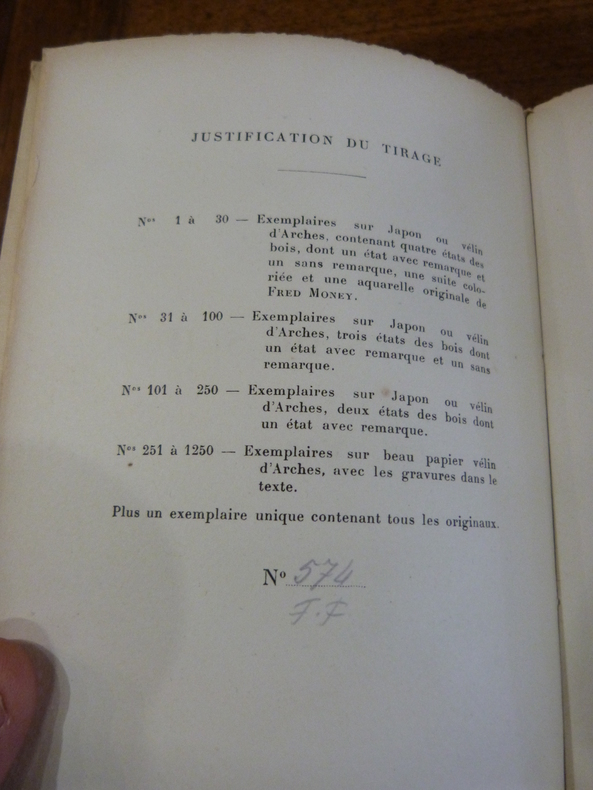 Paris, Ferroud, 1919. Petit in-12, broché, couverture rempliée. Faux-titre, titre, 1 f non chiffré, 109 pp. Tirage limité numéroté à 1250 exemplaires, celui-ci étant un des 1000 sur vélin d'Arches, portant le numéro 574. Ouvrage illustré de 8 compositions en noir par Fred Money, gravées sur bois par Clément et Deloche. Couverture et papier un peu jaunis, petite tache sur le plat supérieur.