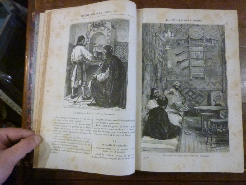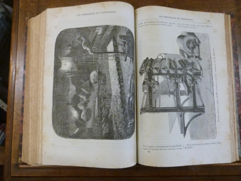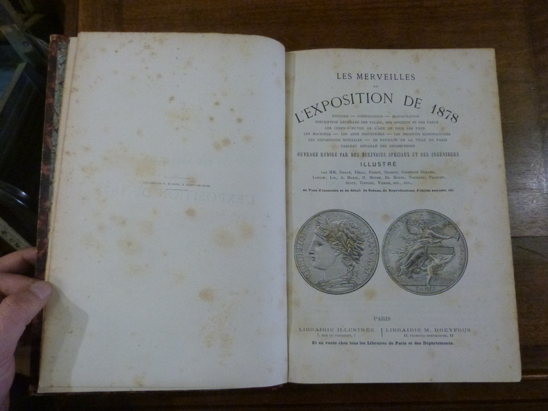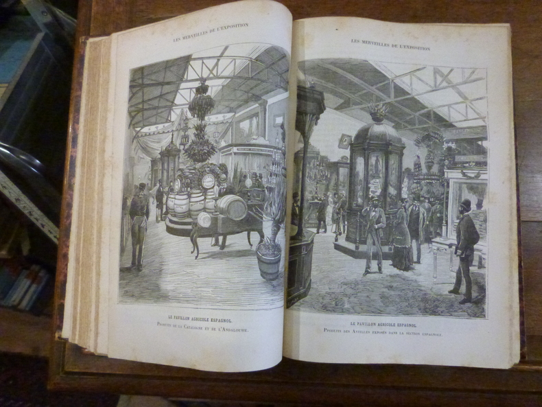 Edition originale de cette exhaustive étude consacrée à l'Exposition de 1878 ; agrémentée d'une abondante iconographie. Exemplaire - agréablement relié - complet de sa grande planche dépliante. Le palais du Trocadéro aussi appelé Palais de pierre est construit pour l'occasion par l' architecte Gabriel Davioud et l'ingénieur Jules Bourdais. Les statues des Continents qui ornent alors la façade du palais du Trocadero, ont été depuis lors réinstallées devant le musée d'Orsay. Au rang des principales attractions : la tête de la statue de la liberté est exposée au Champ-de-Mars, l'aquarium est aménagé sur le site abandonné d'anciennes carrières de pierre à bâtir, situé à flanc de la colline de Chaillot,, l'inventeur Henri Giffard construit un ballon captif de 25 000 m3, capable d’emporter 40 à 50 passagers. (On dit alors que ce ballon, situé aux Tuileries, fit voler en deux mois autant de personnes que depuis le début de l’aérostation...). Parallèlement au ballon captif, la machine servant à produire le gaz permet de gonfler de nombreux ballons libres, permettant des ascensions variées, parfois par groupes (jusqu’à trois ballons simultanément). C'est d'ailleurs l'une des attractions phare de l'exposition où 35 000 personnes volèrent ainsi dans la nacelle. Enfin, et pour l'anecdote, la maison de Champagne Mercier expose un foudre de vin de Champagne d'une contenance de soixante-quinze mille bouteilles. Ce tonneau est pourtant battu en gigantisme par celui de la délégation de l'Autriche-Hongrie. Lequel contient cent-mille litres ! Angles et coupes élimés. Quelques claires rousseurs dans le corps d'ouvrage. Déchirure en marge gauche de la planche dépliante. Du reste, belle condition.