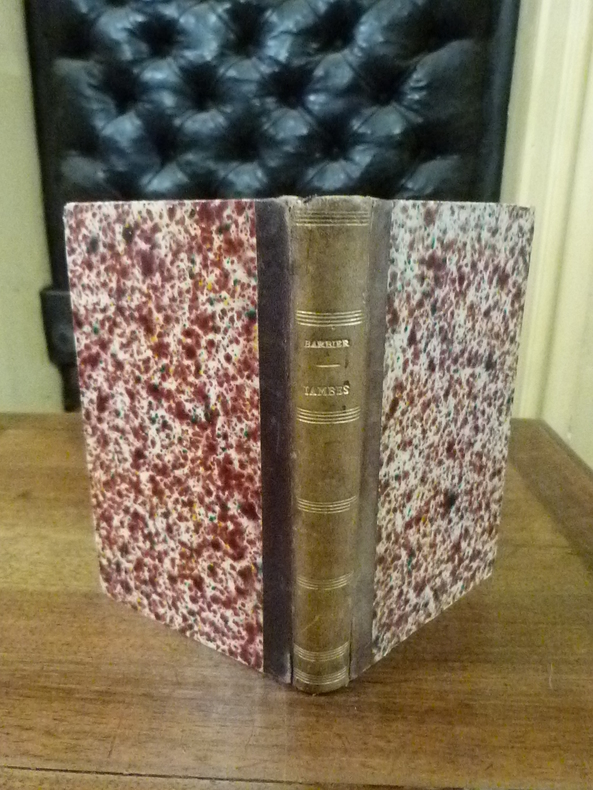 Premier recueil de poèmes de Barbier.Il s’agit de l’œuvre majeure de cet auteur que Barbey d’Aurevilly comparait à Corneille et que Baudelaire désignait comme naturellement poète et grand poète. Ce recueil se compose de poèmes inspirés par la révolution de Juillet 1830 et publiés à partir d’août de cette même année dans « La Revue de Paris » et d’autres journaux comme « La Revue Britannique ». Barbier les réunit dans ce recueil sous le titre Iambes, emprunté à André Chénier.Indigné de voir les Trois Glorieuses escamotées par Louis-Philippe, Barbier se positionne comme protestataire républicain et s’inscrit en faux contre les tenants de l’opinion bonapartiste. A 25 ans il se veut le porte parole de la jeunesse et se révèle direct, véhément, avec un langage sobre mais percutant.Leg.rousseurs a qques feuillets,manques de papier en marge de 3 feuillets,dans l’etat Remise de 20% pour toutes commandes supérieures à 200 €