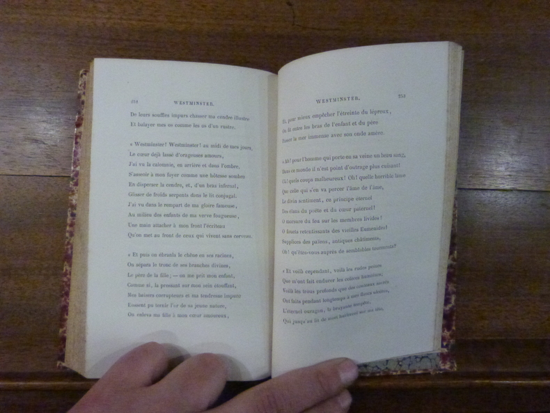 Reliure demi-chagrin rouge à coins. Dos à cinq nerfs avec titre et mention d'auteur dorés. Petits frottements sur les nerfs et les mors. Tranche de tête dorée. Pages non-ébarbées. Papier bruni.