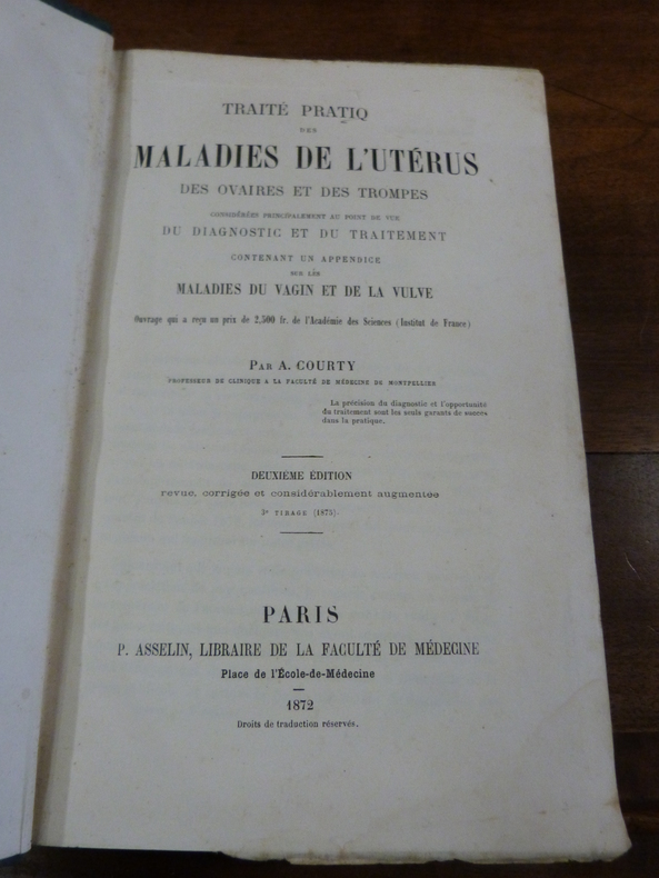 Paris, Asselin, 1872 ; in-8, 1240 pp. + catalogue de l'éditeur, reliure d'éditeur pleine percaline verte. 2ème édition. Ouvrage qui a reçu un prix de 2500 fr de l'Académie des Sciences (Institut de France). L'auteur était professeur de clinique à la Faculté de médecine de Montpellier. Nombreuses figures dans le texte. Bon état.