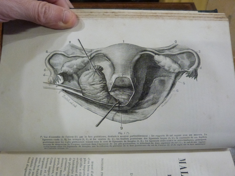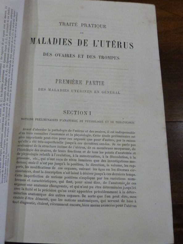 1872 reliure plein chagrin grenat grand in-octavo (binding full shagreen in-octavo), dos long (spine without raised band) décoré or et à froid (gilt and blind-stamping decoration) - titre frappé or (gilt title), papier marbré aux plats (cover with marbled paper), marque-page en tissu vert (bookmark in green tissue), toutes tranches lisses (all smooth edges), pages de garde peignées à motif "caillouté" (painting endpaper), illustrations : 294 figures (294 pictures), cicatrices de mouillures marginales et rousseurs in fine (rare and light redness marks and waterstains at rear), XLIV+1240 pages, 1872 à Paris P. Asselin - Successeur de Béchet Jeune et Labé - Libraire de la Faculté de Médecine,