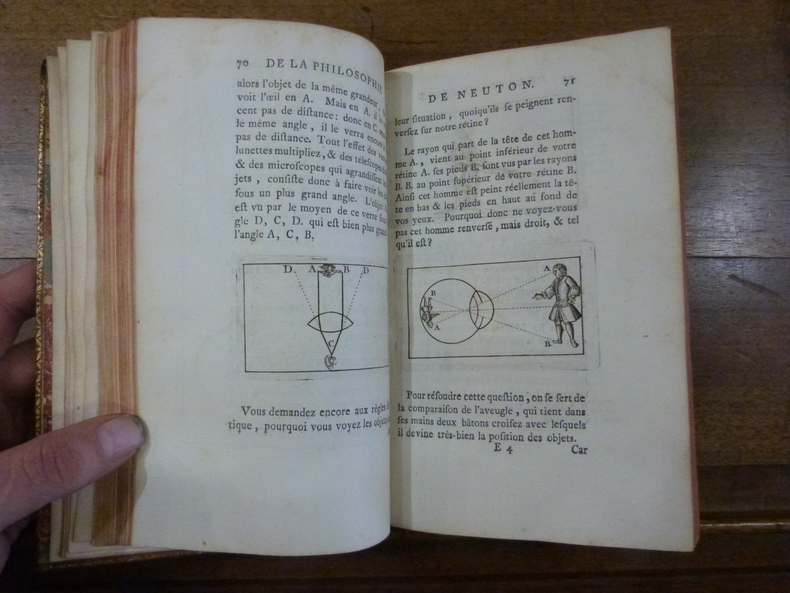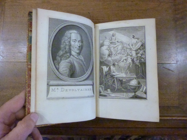 Édition originale. Voltaire commença la composition de son principal ouvrage scientifique pendant l'été de 1736, inspiré par les études mathématiques et scientifiques de la marquise Du Châtelet et l'exemple de Francesco Algarotti. Il propose de convertir les Français au newtonianisme ; rejetant le dialogue, employé par Fontenelle, Algarotti et d'autres, et afin de mettre la science à la portée du public, il adopte un ton sérieux, des illustrations géométriques et des calculs.L'ouvrage parut avant que Voltaire eût envoyé la fin du 23e chapitre et le 24e ; malgré sa réticence, l'éditeur hollandais fit achever cette édition par un mathématicien anonyme et ajouta au titre : mis à la portée de tout le monde. Voltaire fit publier une nouvelle édition à Paris chez Prault, à laquelle il ajouta quelques cartons changeant très peu le texte de l'édition originale.Un frontispice gravé où figure Mme Du Châtelet tenant en main un miroir qui éclaire le visage de Newton ; un portrait de Voltaire gravé par J. Folkema, dessiné par J. Dubourg. 25 culs-de-lampe par Dubourg, Folkema, Konder, Decave, B. Picart et Schley, fleuron de titre gravé par Duflos. 7 figures gravées sur cuivre dont une planche repliée.Très bel exemplaire.Bengesco I, 1570 ; L'Oeuvre imprimé de Voltaire à la B.N., 3744 ; Cohen - De Ricci, 1037.