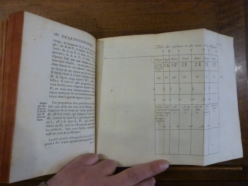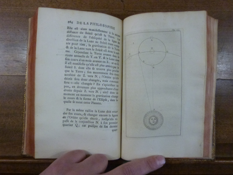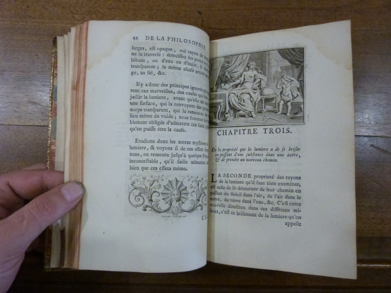 L’introduction des idées de Newton en France et la victoire de l’empirisme sur le cartésianisme. Amsterdam, chez Jacques Desbordes, 1738. In-8 de (1) f. de titre, 399 pp. et (1) p. d’errata; 1 portrait de l’auteur, 1 frontispice, 7 planches hors texte dont une dépliante, 50 culs-de-lampe et vignettes, 60 figures géométriques dans le texte, titre imprimé en rouge et noir, 4 numéros de page grattés. Plein maroquin rouge, triple filet doré encadrant les plats avec fleurons d'angles, dos lisse orné, coupes ornées, roulette intérieure dorée, tranches dorées. Relié par Derome le jeune avec son étiquette. 212 x 132 mm.