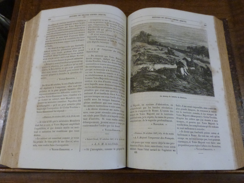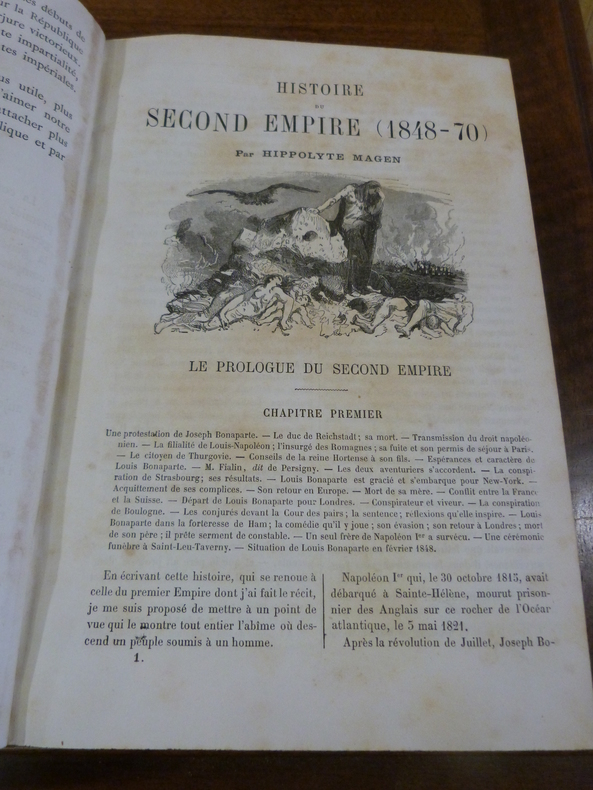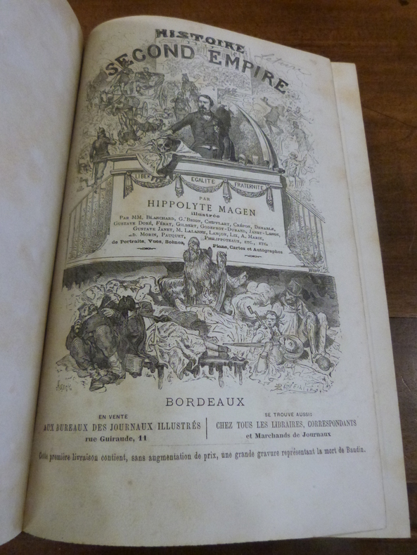Paris, Aux Bureaux des Journaux Illustrés, sans date (vers 1880). In-4 dans une reliure en demi basane rouge. au dos à faux nerfs orné de roulettes dorées et de filets estampés à froid. 1 f. blanc, titre, 2 pp de notes de l'éditeur. 800 pp. Illustré d'une planche double représentant la mort de Baudin sur les Barricades et de nombreuses illustrations in texte en noir et blanc. Frottements à la reliure, papier jauni, rousseurs.