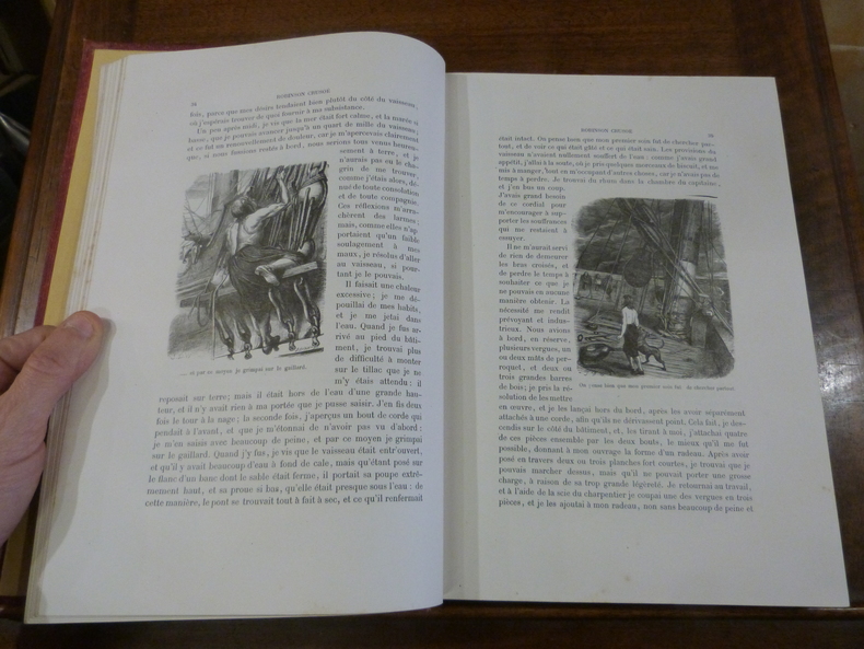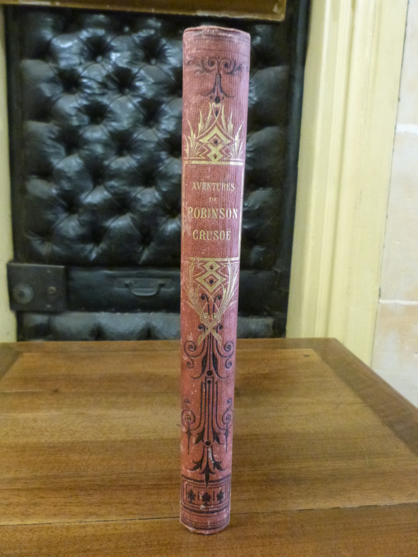 Cartonnage frais mais qui porte à tort au dos le titre “Robinson suisse“, le texte est bien celui de Daniel Defoe“Aventures de Robinson Crusoe“, curieuse erreur du relieur car l'éditeur Lehuby a bien publié une édition du Robinson Suisse mais en 1852, ici il s'agit bien de l'édition de Robinson Crusoe de 1843 (celle de 1857 du même éditeur n'a pas le même nombre de pages)..( GrF)