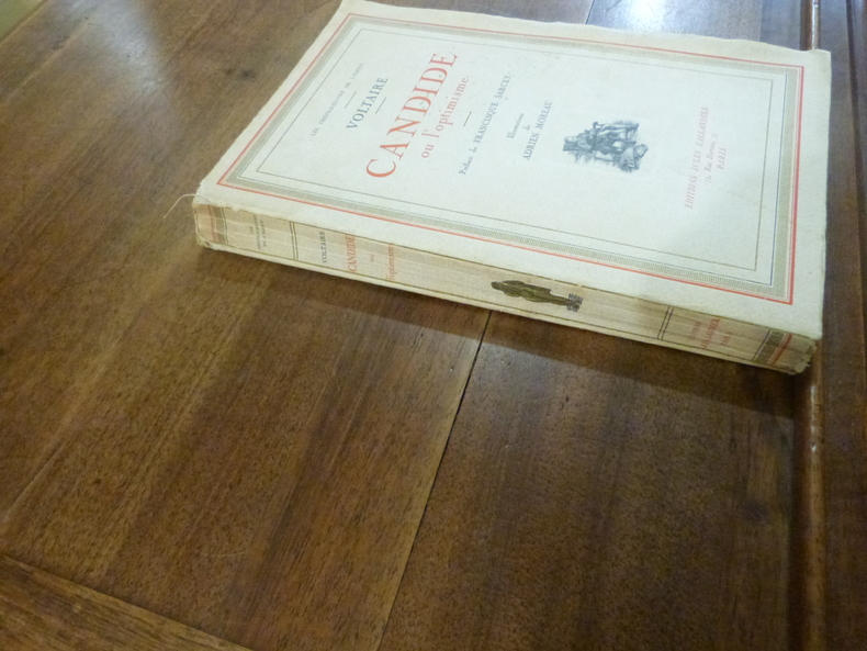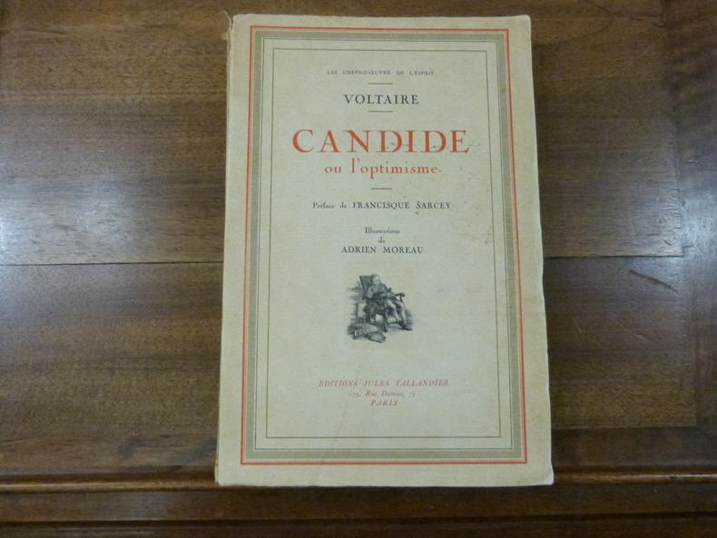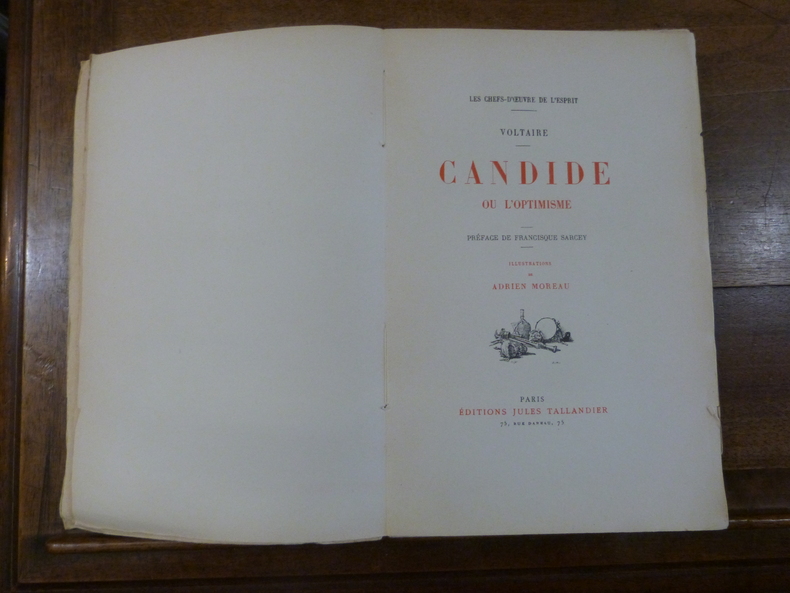 Paris JULES TALLANDIER / Les chefs d'oeuvre de l'esprit, sans date 0 un volume (250 x 160mm), XVI 174 pp. Reliure souple en plein chagrin, dos à nerfs orné, gardes marbrées, couverture imprimée conservée (reliure ancienne). Ouvrage illustrée de dessins d'Adrien Moreau dont dix hors-texte. Portrait de Voltaire en frontispice.