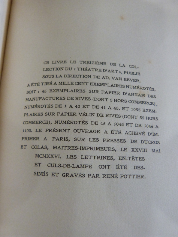 "Edition décorée de compositions originales dessinées et gravées sur bois par René Pottier; N° 259 sur 1055 exemplaires numérotés sur papier vélin de Rives."