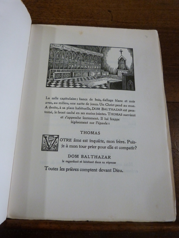 Paris, Éditions G. Crès, le Théâtre d'Art, 1926. 1 vol. in-8, (20,5 x 16 cm) ; [1] f., 122 pp. et [3] ff. Reliure en plein vélin à la Bradel orné d'un décor peint : deux moines dans le cloître au soleil couchant au premier plat, l'auteur, le titre et un vitrail au dos, et un moine en prière au deuxième plat, avec la signature "G. AUGER 9/28", tête dorée. Couvertures et dos conservés. Sous étui.