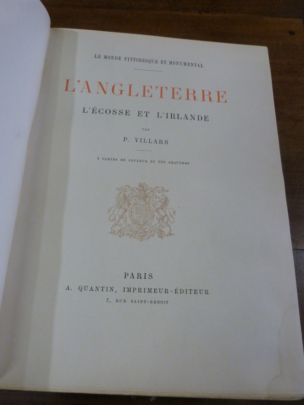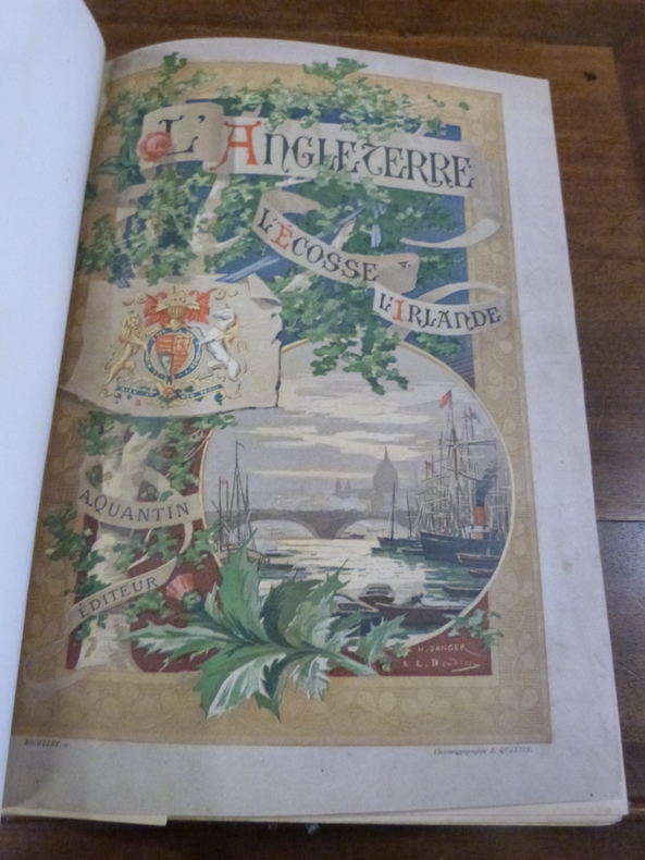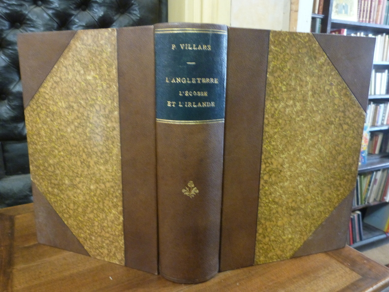 comprenant 4 cartes en couleurs et 600 gravures. Table; De Douvres à Londres - Londres et ses environs - La province Anglaise - L’Écosse - L'Irlande. 4 Cartes et plans couleurs; Plan de la ville de Londres - Environ de Londres - Angleterre et pays de Galle - Écosse et Irlande. vol in-4, 300x220, reliure signée Lenègre, demi chagrin ,dos à nerfs orné de caissons dorés, tranches dorées, coins leg. émoussés, 676pp. Couvertures d'origines couleurs conservées. Paris, A. Quantin, ss date, 1890