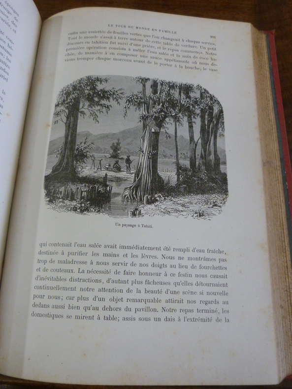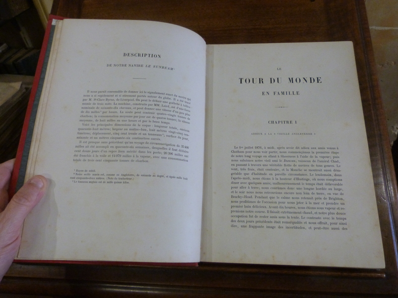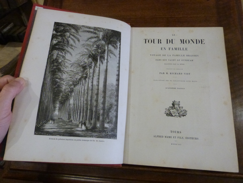 Première édition du 1er voyage de la famille Brassey, qui embarqua sur leur yacht "Sunbeam" le 1er juillet 1876 avec leur trois filles, leur fils et leurs animaux domestiques, chiens, oiseaux, chaton. Ce voyage les amènera à Madère, à Rio, au Chili, à Tahiti, à Yokohama, Singapour, avant le retour en mai 1877. Ouvrage illustré de 78 compositions dans et hors-texte gravées sur bois.