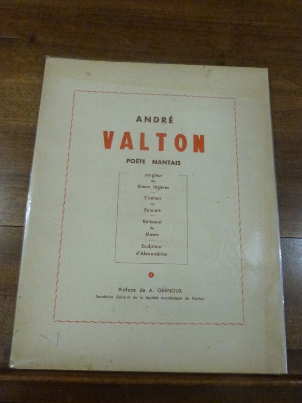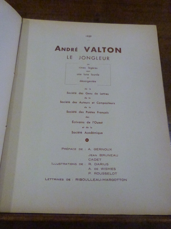 Fontenay-Le-Comte, Imprimerie Bouyac, 1959. Plaquette in-4, brochée, couverture rempliée. Titre, 14 ff non chiffrés. Tirage limité numéroté à 360 exemplaires, celui-ci portant le numéro 242. Ouvrage illustré de compositions par Bruneau, Cadet, Darius, de Wismes et Rousselot, lettrines de Riboulleau-Margotton. Envoi de l'auteur à Gilebrt Dupé. Couverture tachée et un peu piquée, papier jauni.