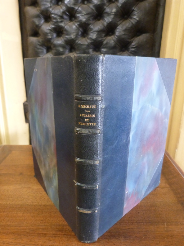 Paris, Editions d'art Piazza, 1929. In-4 en demi-chagrin à coins bleu, couvertures et dos conservés. Tranche supérieure dorée. Non paginé (202 pp). Illustré de 12 planches en couleurs par Léon Carré et typographie manuscrite, décors de lettrines, bandeaux et culs de lampe par Novatto. Edition à tirage limité et numéroté à 500 exemplaires celui-ci étant un des 375 sur pur chiffon de Rives. Frottements aux nerfs et aux coins. Quelques rare rousseurs sur certaines pages.
