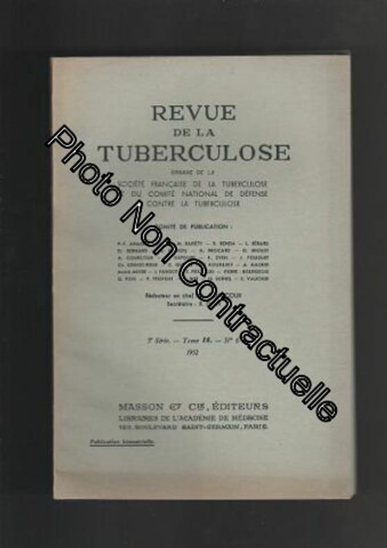 Masson et Cie Revue 1952 In-8, (24x16 cm), broché, paginé de la page 750 à la page 906, précédé d'un index bibliographique paginé en chiffres romains de XXXI à XXXVI, revue de la Société d'études scientifiques sur la tuberculose et du comité national de défense contre la tuberculose, A. Courcoux rédacteur en chef, quelques illustrations en noir et blanc ; couverture à peine usée, dos légèrement décalé, très bon état général. Livraison a domicile (La Poste) ou en Mondial Relay sur simple demande.