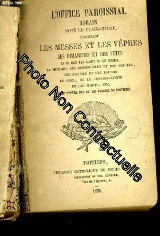 Imprimerie H. Vatar. 1878. In-12. Relié plein cuir. Etat passable, 1er plat abîmé, Dos abîmé, Papier jauni. 680 + 6 + 336 pages. Un ex-libris à l'encre sur la page de garde. Rousseurs. Mouillures. Coins frottés.. . . . Classification Dewey : 264.1-Les prières