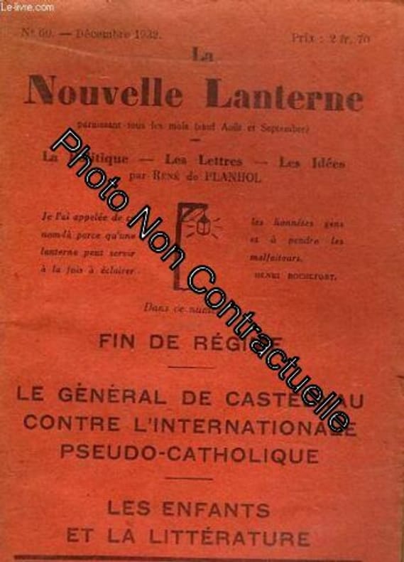 La politique, les lettres, les idées par René de Planhol. Fin de régime, Le général de Castelnau contre l'internationale pseudo-catholique. Les enfants et la littérature. Classification Dewey : 70-Journalisme, édition. Journaux