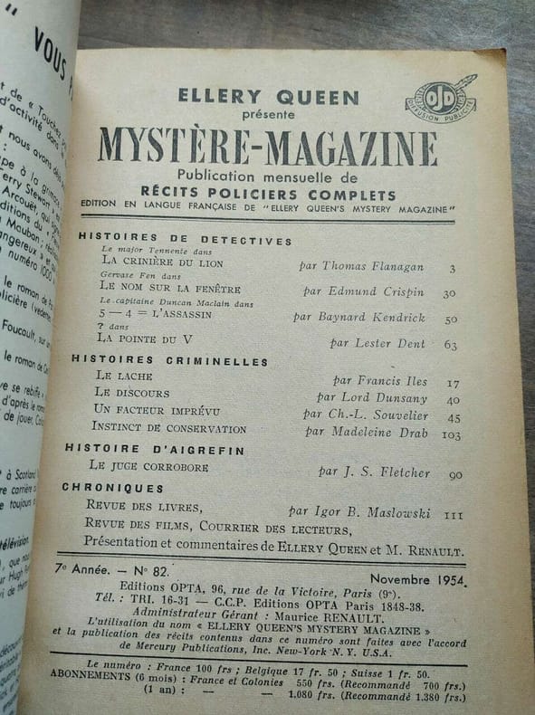 1954 1954. Ellery Queen Mystère-Magazine N°82 (voir sommaire)/ Editions opta Novembre 1954 . Ellery Queen Mystère-Magazine N°82 (voir sommaire)/ Editions opta Novembre 1954