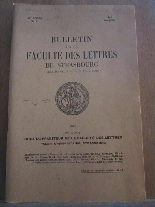 1961 1961. Bulletin de la Faculté des Lettres de Strasbourg 39ème année N°8 Mai-juin 1961 Référence: LMA16K. Bulletin de la Faculté des Lettres de Strasbourg 39ème année N°8 Mai-juin 1961