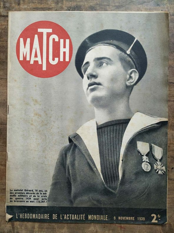 FORMAT 27 CM X 35,5 CM-40 PAGES-EN COUVERTURE; LE MATELOT GERARD, UN DES PREMIERS DECORES DE LA MEDAILLE MILITAIRE ET DE LA CROIX DE GUERRE 1939-LE MATCH DE LA GUERRE; DIXIEME SEMAINE DE LA GUERRE, 4P-EN PATROUILLE A LA MER; PHOTOS A BORD D'UN TORPILLEUR FRANCAIS, 7P-TREIZE DE L'OPERA VONT DANSER POUR EUX; PHOTOS DES DANSEURS DIRIGES PAR LYSETTE DARSONVAL EN REPETITION AVANT DE PROMENER LEUR SPECTACLE POUR LES SOLDATS, 2P-11 NOVEMBRE; PHOTOS DES MANUSCRITS HISTORIQUES DE L'ARMISTICE DE 1918, 2P-URSS 1939; PHOTOS DANS LES RUES DE LA RUSSIE MODERNE, 6P-LE SERGENT ANDRE MAGINOT A DONNE A LA FRANCE SA CUIRASSE, 2P-PIGEONS EN UNIFORME. PHOTOS DES PIGEONS VOYAGEURS MILITAIRES, 4P-"LES INCONNUS DANS LA MAISON", UN ROMAN INEDIT DE GEORGES SIMENON, 2P-DESSIN DE CHANCEL, 1P-"IDYLLE EN BLEU", CONTE INEDIT DE JOSEPH JOLINON, 2P-STRASBOURG VILLE ENDORMIE; PHOTOS, 4P-