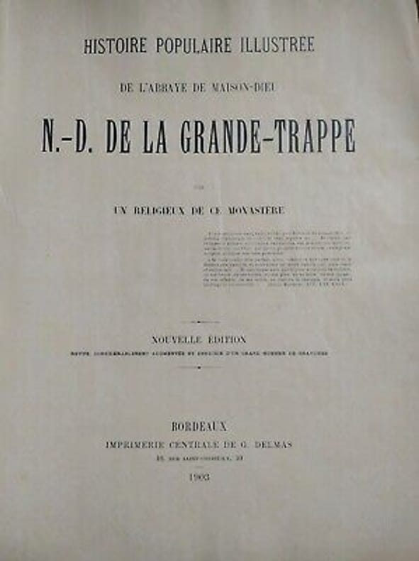 Edizione del 1903 di questa opera sulla storia illustrata dell'Abbazia La Trappe, abbazia in Normandia da cui i monaci cistercensi presero il nome di trappisti. All'interno sono presenti numerose foto in bianco e nero e illustrazioni nel testo. In buone condizioni. Copertina editoriale in discrete condizioni generali con lievi usure ai margini e dorso. Legatura in buone condizioni. Pagine in buone condizioni con rare fioriture. In 4. cm 31,5x23,5. Pp. XI+374+(2).