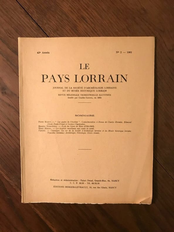Nancy, le Pays Lorrain, 1961 ; in-4, 40 pp., couverture beige et cahiers agrafés. Sommaire: Pierre MAROT: «Les quatre de l'Institut» Commémoration à Dieuze de Charles Hermite, Édmond About, Émile Friant & Gustave Charpentier, p. 39./ Général Maurice DUMONTIER: École du Génie de Metz (1794-1802), p. 49./ Henri HIEGEL: Les localités mosellanes aux noms de saints, p. 59./ Variétés-Chronique: ***: La vie de la Société d'Archéologie lorraine et du Musée historique lorrain, p. 69./ ***: Nouvelles lorraines, p. 69.