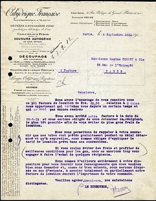 1912 1912. Facture 1912 OXHYDRIQUE FRANCAISE Oxygéne et Hydrogéne Purs Chalumeaux Pyrox