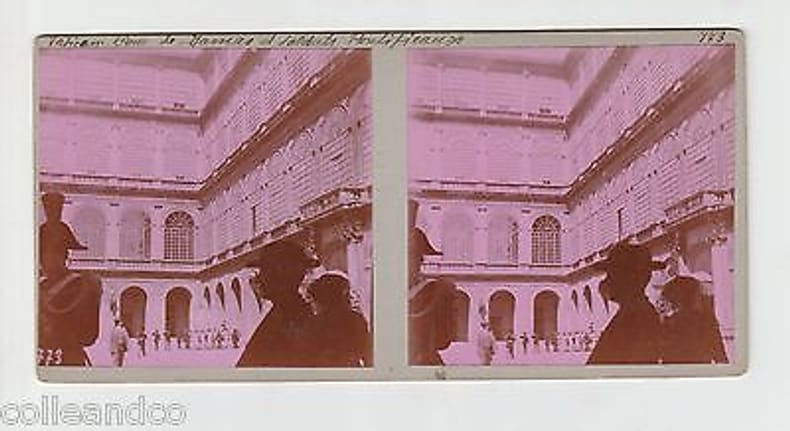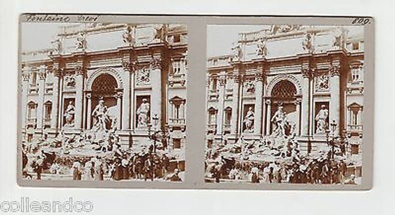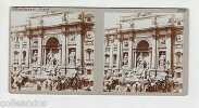 1910 1910. Ancien carton stéréoscopique vers 1910 celui-ci à la particularité de comporter 2 clichés / photos collées sur le RECTO ET VERSO :. - Recto : Palais du Vatican Cour Saint-Damase et soldats pontificaux. - Verso : Fontaine de Trevi