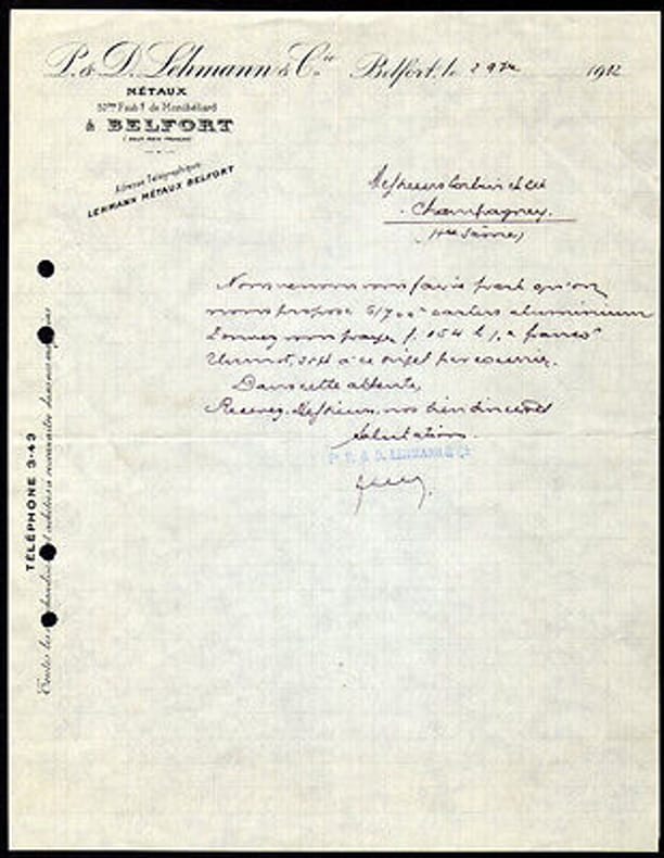 1912 1912. Ancienne Facture P. & D. LEHMANN & Cie métaux à Belfort 1912 dép 90