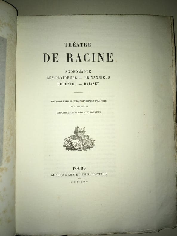 1876 1876. Bon état. Couverture défraichie / fanée mais solide petites rousseurs plus ou moins nombreuses selon les pages. Contient : Andromaque - Les Plaideurs - Britannicus - Bérénice - Bajazet XVI-393pp non rognées. EX n°92 sur papier vergé