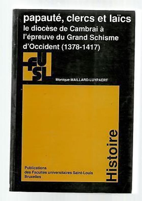 Maillard 2001 2001. gros volume broché 686 pages publications des Facultés universitaires Saint Louis Bruxelles; édition originale 2001. le diocèse de Cambrai à l'épreuve du Grand Schisme d'Occident ( 1378-1417). La double élection pontificale de 1378. L'interminable conflit au sommet de l'Eglise la division de la chrétienté l'agitation du monde universitaire le désarroi des fidèles le trouble des consciences. Il semblait que le sujet avait été épuisé. Mais le colloque d'Avignon de 1978 consacré à la genèse et aux débuts du Grand Schisme d'Occident. avait renouvelé la problématique et relevé que la Belgique était le seul pays d'Europe occidentale à ne présenter aucune étude d ensemble. Une lacune qu'il fallait combler tôt ou tard. Pour mener pareille étude il importait de descendre des sommets de l'histoire ecclésiastique et de partir à la rencontre des hommes et des femmes qui entre 1378 et 1417 avaient noué des relations avec la papauté qu'ils fussent guidés par des préoccupations spirituelles ou motivés par des intérêts matériels Pour ce faire. on ne pouvait imaginer meilleur cadre qu'un vaste diocèse de confins. A la croisée des influences française flamande bourguignonne. liégeoise et impériale le diocèse de Cambrai fut d'abord le théâtre d'une lutte d'influence entre les papes romain et avignonnais avant de se rallier avec une belle unanimité dès 1409 à la solution conciliaire de la crise. A propos de l'auteur : Née le 19 octobre 1949 à Uccle Monique Maillard-Luypaert a obtenu la candidature en histoire aux Facultés (1969) puis la licence (1971) et le doctorat en philosophie et lettres à l'U.C.L. (1996). Elle a commencé sa carrière dans l'enseignement secondaire auquel elle reste attachée avant d'enseigner au Séminaire épiscopal de Tournai et à l'Institut supérieur d'histoire de l'art et d'archéologie de Bruxelles. Elle est chercheur associé aux Facultés (Centre de recherche en histoire du droit et des institutions) et collaborateur au programme Fasti Ecclesiae Gallicanae du C.N.R.S. Médiéviste membre de l'Institut historique belge de Rome depuis 1972 elle s'occupe de la publication des lettres pontificales et des suppliques de la Pénitence aux évêques de Cambrai et à leur entourage ainsi qu'aux dignitaires et aux chanoines du chapitre cathédral (1200-1500). en TRES BON ETAT d'occasion ; complet et solide sans annotations ni déchirures ; intérieur impeccable propre et frais. vu le prix envoi obligatoirement en mode sécurisé et traçable