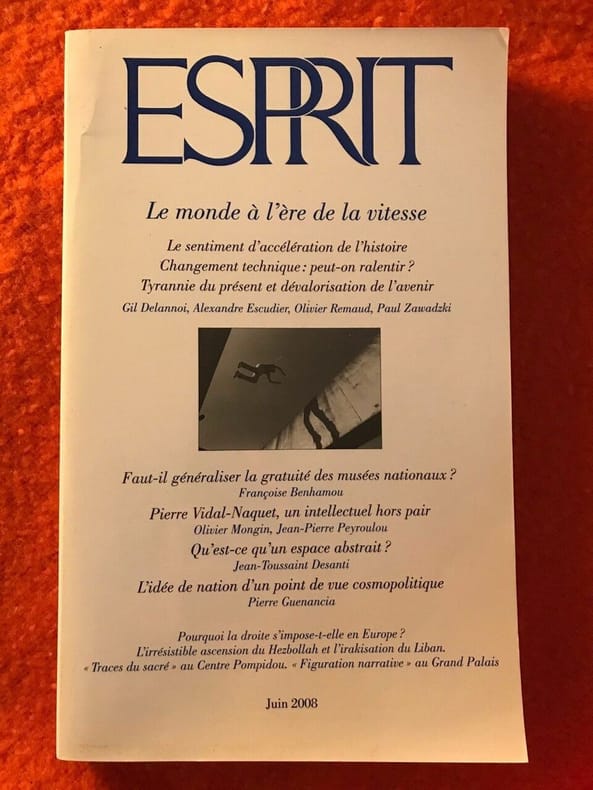 Paris Esprit 2008 Grand in 8 238 pages - broché - Au Sommaire : Le sentiment d'accélération de l'histoire par A.Escudier / Maitre et Esclave de la vitesse : le tachysanthrope par Gil delannoi / Petite Philosophie de l'accélération de l'histoire par O.Remaud / les équivoques du présentime par Paul Zawadzki / L'idée de nation d'un point de vue cosmopolitique par P.Guenancia / Qu'est ce qu'un espace abstrait par J.T. Desanti / Pierre Vidal-Naquet , un intellectuel hors pair par Olivier Mongin et JP Peyroulou : Etc . trés bon etat